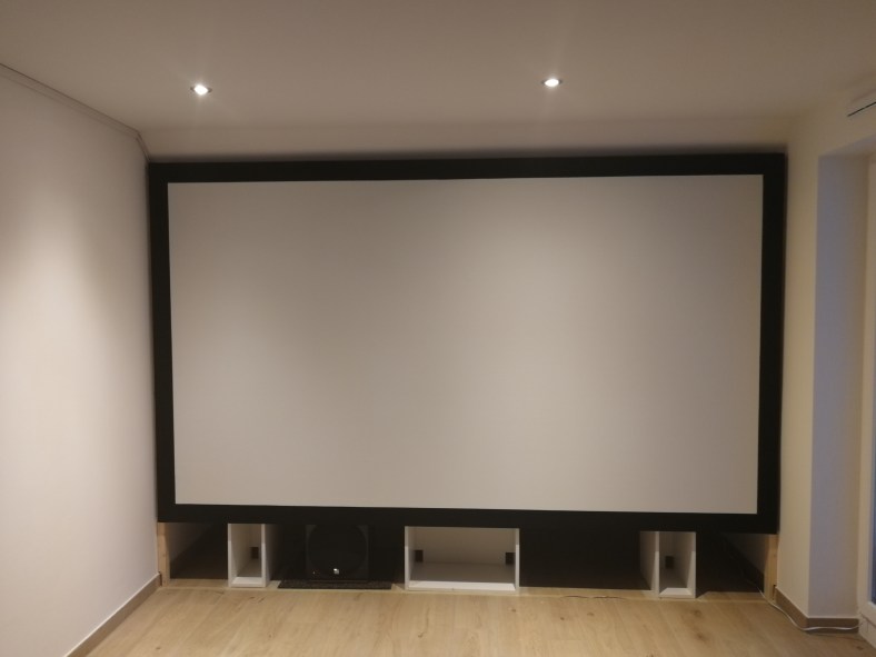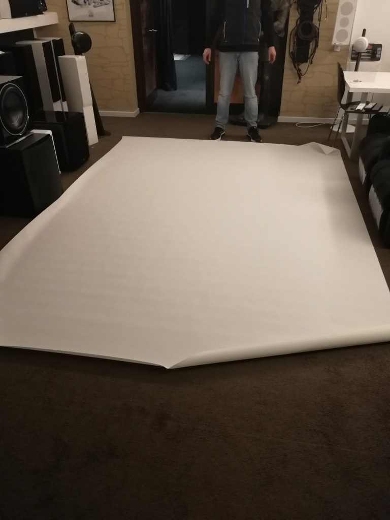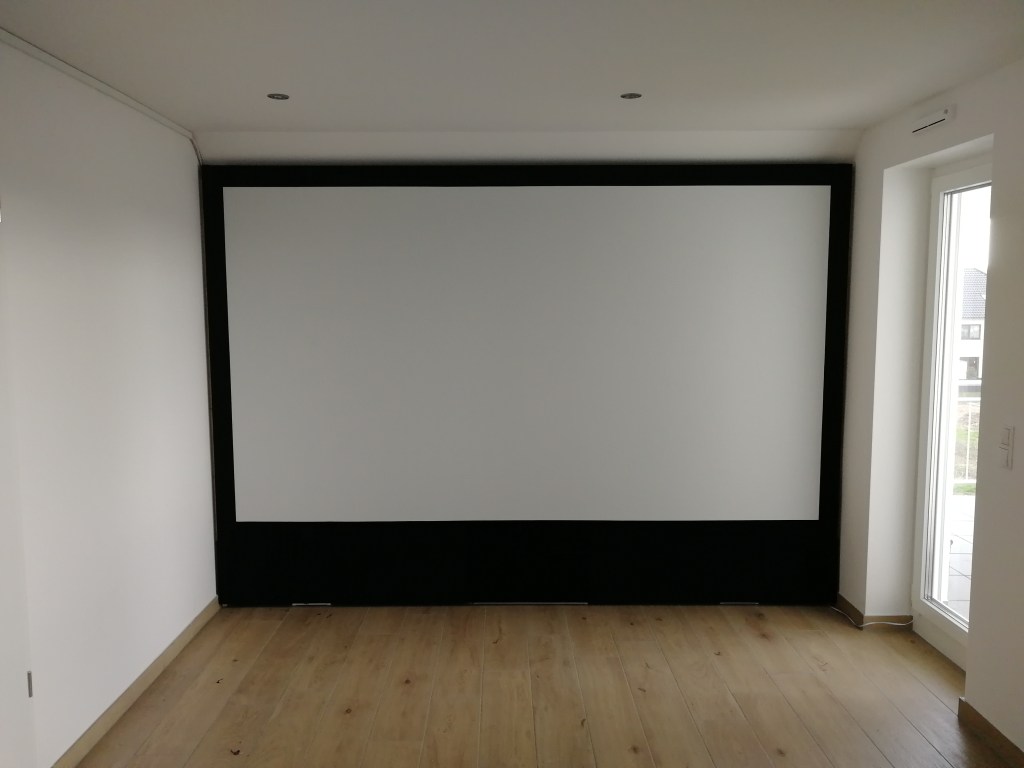 Die Frage der Leinwand konnte beim letzten Besuch auch noch nicht endgültig geklärt werden, hat mich aber nicht so „gequält“ wie die Beamerfrage. Nichts desto trotz musste ich mich entscheiden. Im Prinzip gab es nach online Recherche nur die Elite Screens EZ mit Akustiktuch zur Auswahl. Allerdings hatte ich einen Vorteil, ich kannte Christian (Heimkinoraum Köln).