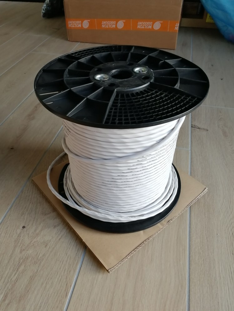 Da ich mich bei der Länge des Subwooferkabels direkt mal um 2 Meter vermessen habe, habe ich die Lautsprecherkabel alle etwas großzügiger abgemessen. Vorne also 15 m, 14 m, 13 m; die Deckenlautsprecher 5,5 m bzw 4,5 m; Surroundlautsprecher 5 m und 2 m. So komm ich auf ca. 60 m Lautsprecherkabel. Subwooferkabel (das ich am Samstag umtauschen darf) wird dann 13 m (statt 10).