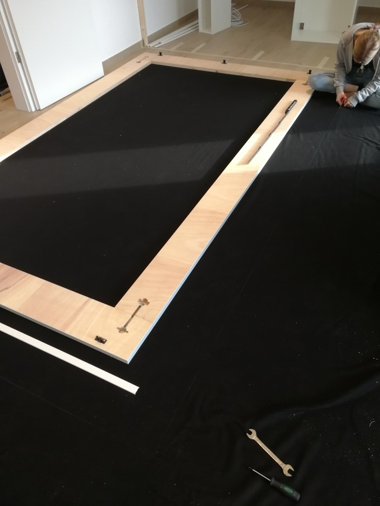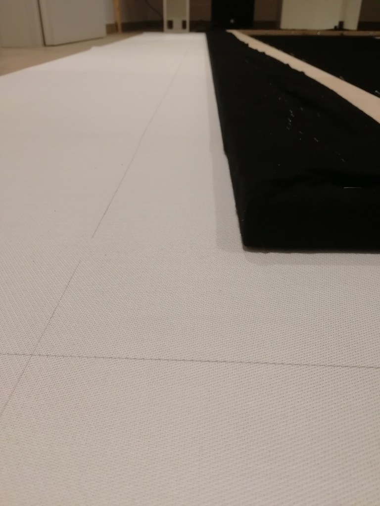 Als nächstes ging es ans Black-Backing (nicht verwechseln). Da ich das vor 3 Wochen auch das erste Mal gehört habe, hier meine laienhafte Erklärung: Es geht dabei darum, dass (vor allem akustisch transparente) Leinwand-Tücher immer ein bisschen lichtdurchlässig sind. Um den Lichtverlust so gering wie möglich zu halten, versucht man es hinter der Leinwand möglichst dunkel zu halten. Die Experten vom Heimkinoraum haben mir dazu geraten über den Rahmen schwarzen Bühnenmolton zu spannen und aus diesem die Lautsprecherfronten so genau wie möglich auszuschneiden. Also Bühnenmolton bestellt, im Internet geschaut, wie man etwas auf einen Rahmen spannt und das ganze dann wie geplant umgesetzt.