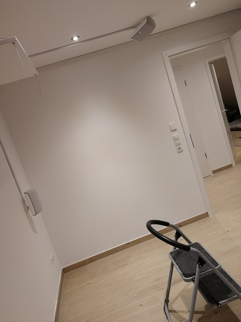 Bei der Aufstellung bzw. Ausrichtung der Surround- und Deckenlautsprecher habe ich mich etwas schwer getan. Wenn man nur einen Hörplatz hat, ist die Ausrichtung relativ simpel. Bei einem 4er Sofa muss man aber definitiv Kompromisse machen. Da ich Fazon Sat von Dali verbaut habe, hatte ich immerhin die Möglichkeit, diese um ca. 15° anzuwinkelen. Ich habe mich schließlich dafür entschieden, die normale Wandhalterung zu verwenden und die Lautsprecher maximal anzuwinkeln. Die Lautsprecher sind zwar so nicht 100% auf die Haupt-Hörposition ausgerichtet, aber es sieht besser aus, als wenn ich die Standfüße irgendwie an die Wand zimmere und halten wird es vermutlich auch besser. Obwohl ich bei den Deckenlautsprechern doch ein etwas mulmiges Gefühl habe, wenn ich mir die winzige Schraube angucke, mit der die – lediglich aufgesteckten – Fazon Sat arretiert werden.