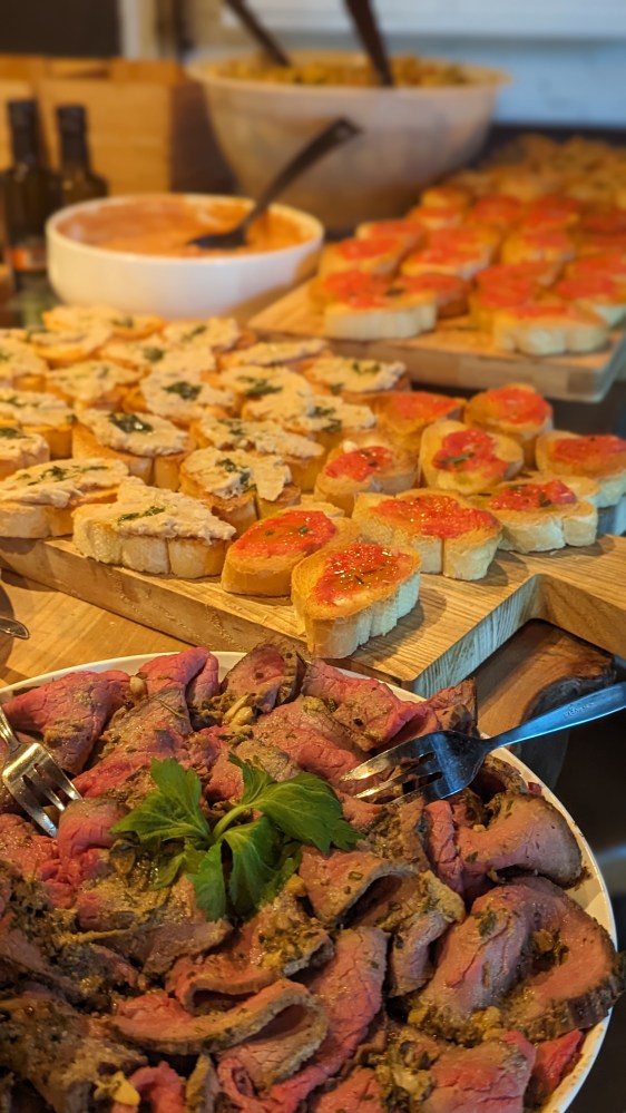 Die Hauptspeise wurde als Buffet serviert. Es gab ein Roastbeef mit orientalischem Blumenkohl aus dem Ofen, mediteranem Kartoffelsalt, zweierlei Bruschetta, Dakwa, Hummus und (veganer) Aioli: